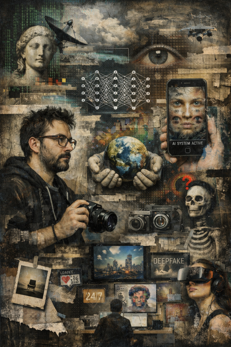 Imagen posfotográfica generada con inteligencia artificial que explora el archivo digital, el error visual y la ruina como residuos de los sistemas técnicos contemporáneos de producción de imágenes.